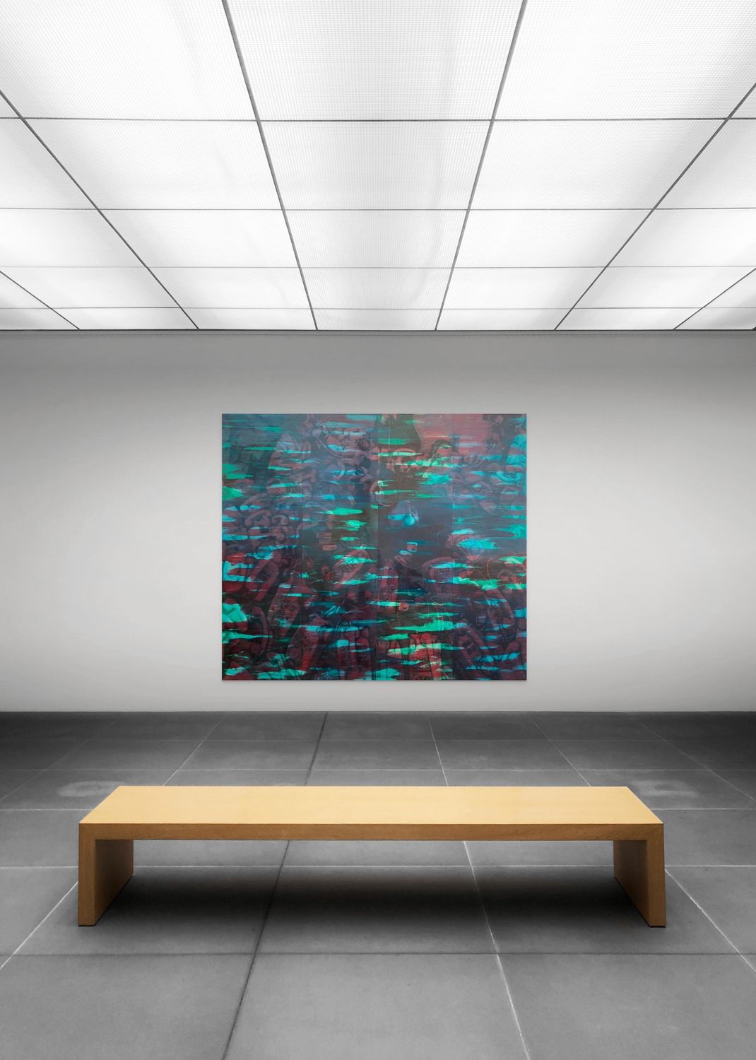 I dette dragende værk af Mette Gitz-Johansen forenes det figurative og det abstrakte i et hypnotisk lagspil. Under overfladen anes ansigter og kroppe, som dukker op og forsvinder mellem turkise penselstrøg og rødlige, transparente mønstre. Det digitale præg og lagdelingen giver værket en rytme, som minder om scanning eller søgning – som om maleriet registrerer eller overvåger sin egen virkelighed. Farvekontrasten mellem det kolde blågrønne og det varme rødlige skaber både spænding og dybde.