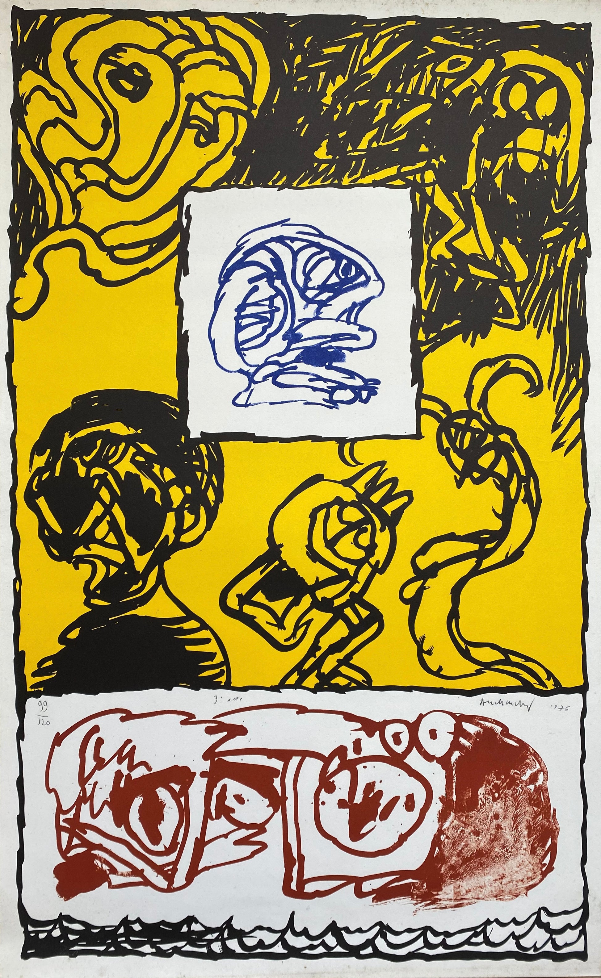 Et ekspressivt værk opdelt i tre horisontale felter, hvor figurer og ansigter udfolder sig i en spontan og energisk streg. Øverste og midterste del domineres af en varm gul baggrund, hvor sort og blå grafik danner menneskelignende former og fabulerende væsener. Nederste del i brunrød og sort fremstår som en anden virkelighed – fragmenteret og drømmende. Billedet balancerer mellem fortælling og kaos.