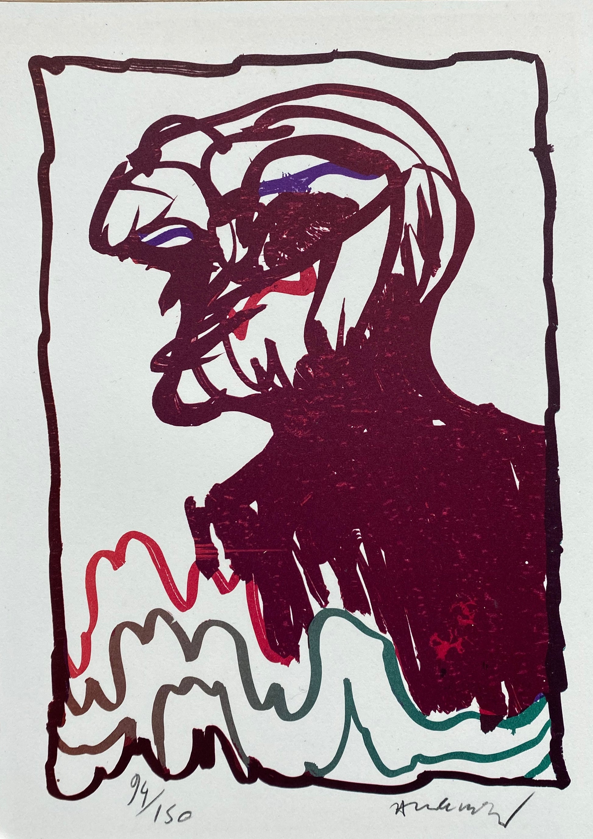 Dette grafiske værk viser en ekspressiv og forvrænget portrætfigur i mørkerød og sort, omgivet af bølgende linjer i grøn, rød og lilla. Ansigtet fremstår næsten som en maske, sammensat af kantede og energiske strøg, der giver motivet en psykologisk dybde og intensitet. De kurvede linjer nederst bryder kompositionens opadgående spænding og skaber en rytmisk balance. Trykket er signeret og nummereret (94/150), hvilket vidner om en begrænset og eksklusiv udgave.