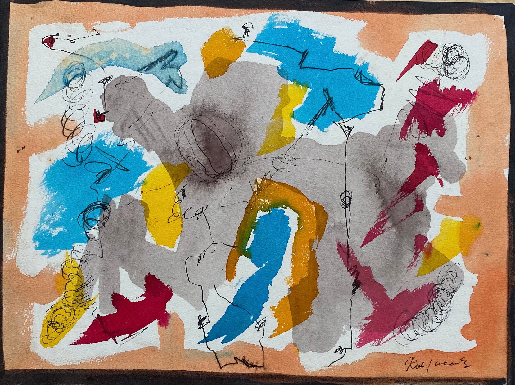 Dette levende og spontane værk kombinerer akvarel og blæk i en dynamisk komposition. De klare farver – blå, gul, rød og brun – blander sig med transparente grå flader og en løs, næsten legende stregføring. Værket rummer en energisk lethed, hvor de skitseagtige linjer danser hen over farvefladerne og skaber en følelse af bevægelse og improvisation. Et udtryk fuld af rytme og abstrakt fortællelyst.