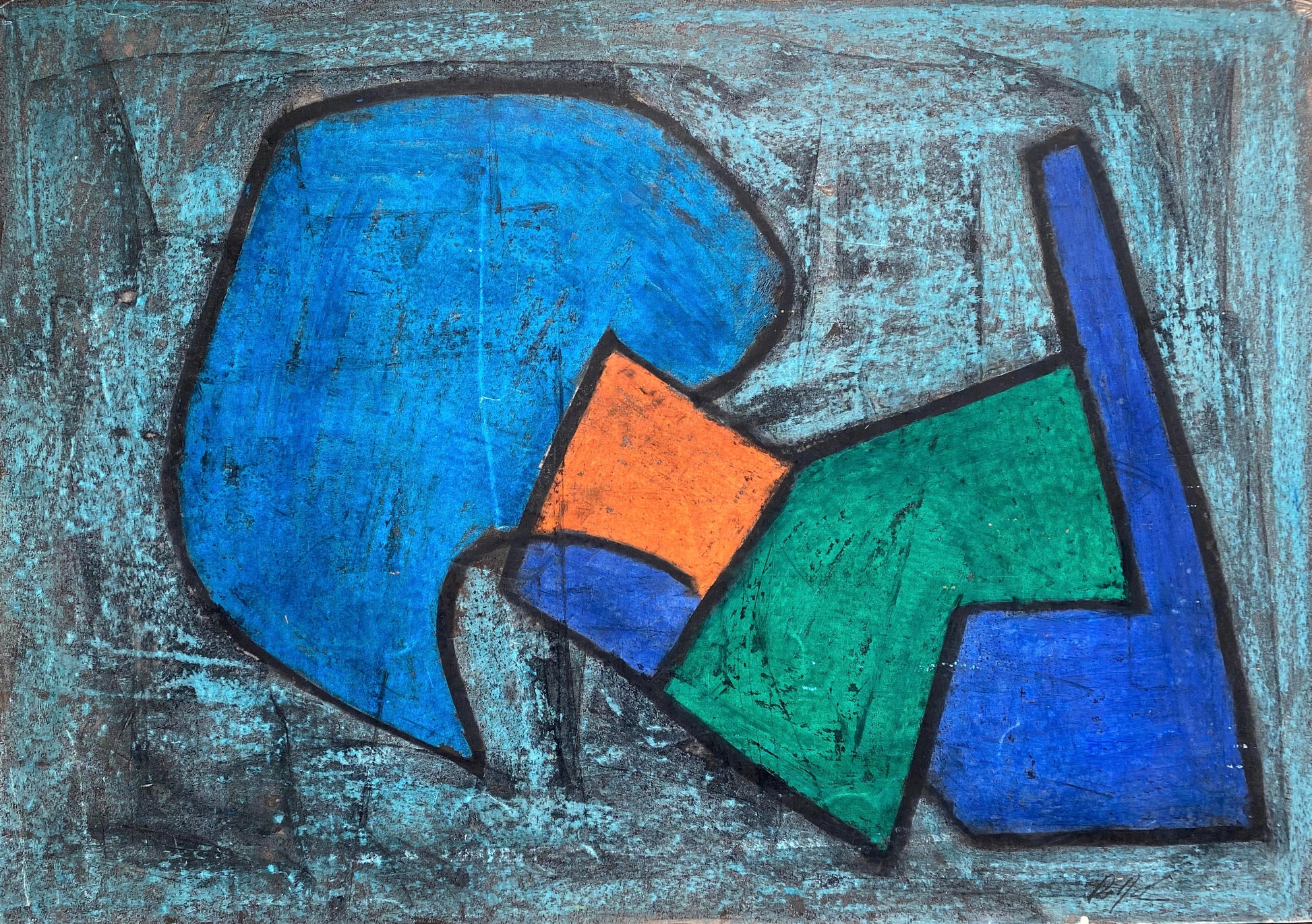 Et geometrisk og farvestærkt værk, hvor klare primærfarver mødes i en sammensat, næsten skulpturel komposition. De abstrakte former er omkranset af en markant sort kontur, som skaber struktur og kontrast mod den teksturerede baggrund i kølige gråtoner. Maleriet balancerer mellem leg og streng form, og inviterer til fri fortolkning.